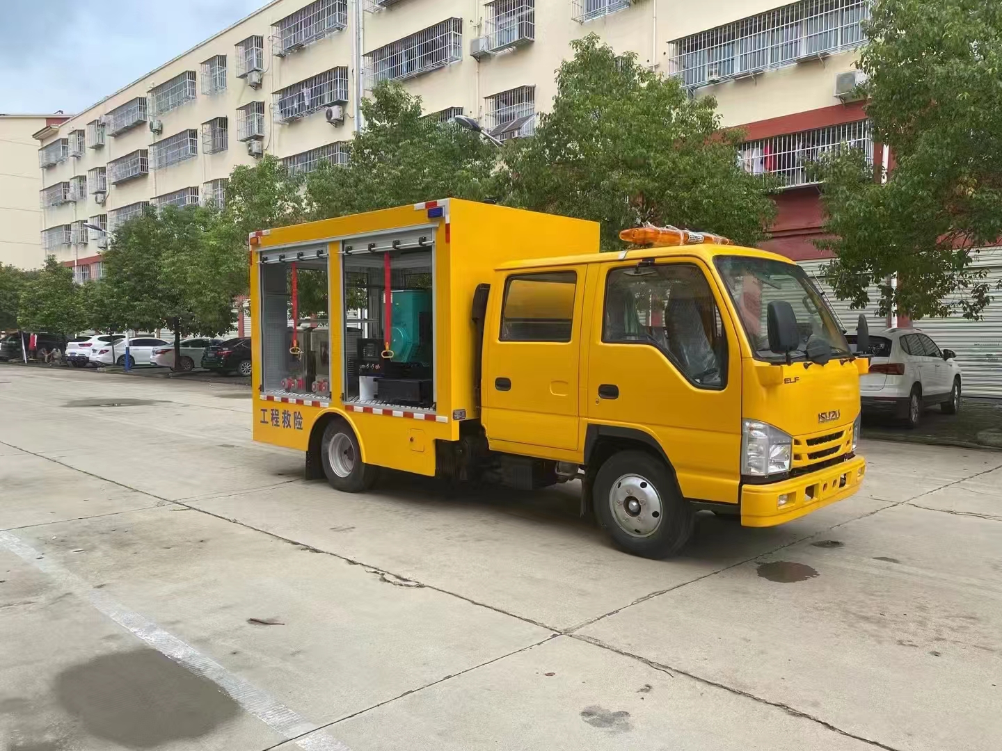 | 上裝配置 | 車箱一體式全封閉車箱車箱有隔音功能,廂體防火,阻燃,防雨,防塵,防銹,降噪,隔震,長期抗震結構,廂體外觀按照公告外觀制作,左右卷簾門,尾部是卷簾門,廂內安裝LED作業燈,作業燈帶獨立開關,底板采用花紋板。配備康明斯50KW發電機組,2臺功率22KW便攜式超輕型高速潛水泵,單臺水泵流量可達500m³/h,單泵配40米排水管(20米/根),水管直徑 DN200mm,水管材質為滌綸長絲編織。配有升降照明燈,升降燈可通過無線和有線遙控兩種方式控制,升降燈升降高度為1.2米,可水平旋轉。帶接地樁和接地電纜線,便攜泵控制柜,潛水泵浮圈,長排警燈,倒車影像,配兩只手提式干粉滅火器2只。其余為標配… | ||