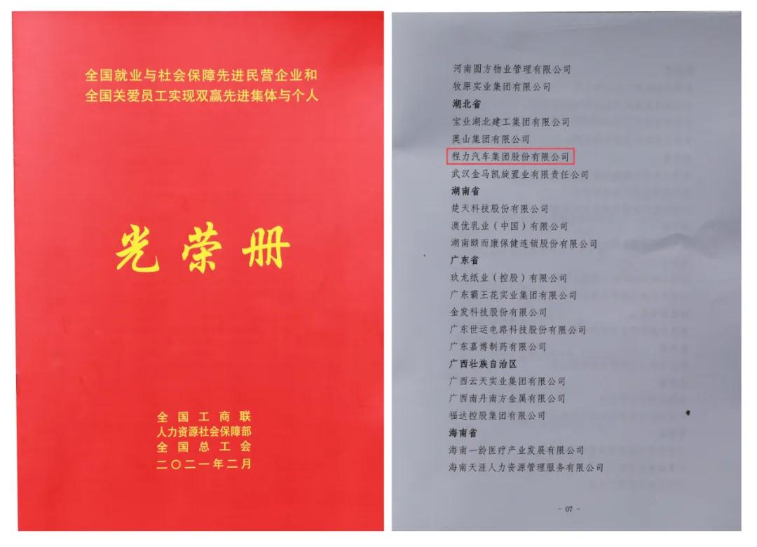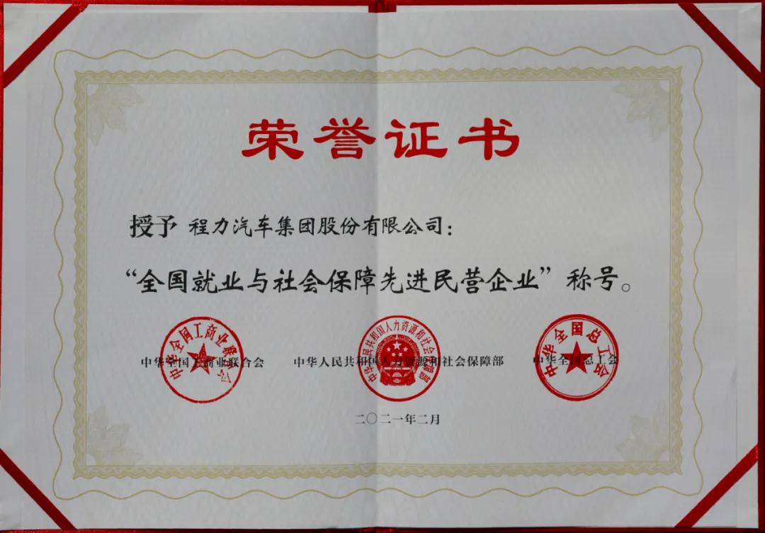 3月2日,程力汽車集團股份有限公司收到國家人力資源和社會保障部、中華全國工商業聯合會、中華全國總工會聯合頒發的“全國就業與社會保障先進民營企業”榮譽證書及牌匾,這是程力汽車集團股份有限公司在2021年初被授予的開門紅全國性殊榮,也是程力集團繼2020年連續三次受到全國性榮譽表彰。